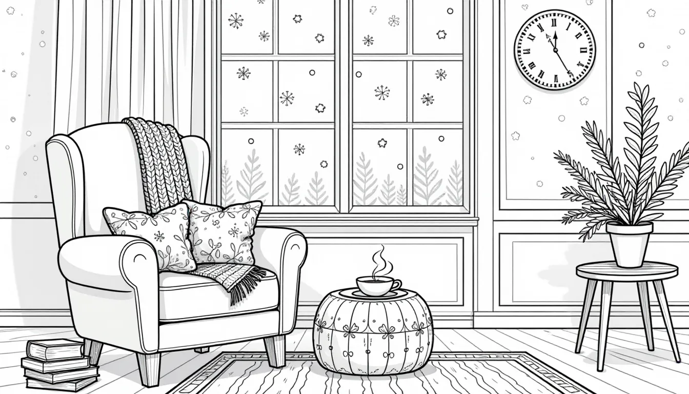 This intricate black-and-white line art illustration captures a cozy comfort scene designed for adult coloring enthusiasts. It features a plush armchair with a knitted throw blanket, decorative cushions, and a wooden side table with a steaming cup and stacked books. The serene backdrop of softly falling snowflakes outside large windows completes this inviting atmosphere, providing a relaxing coloring experience.