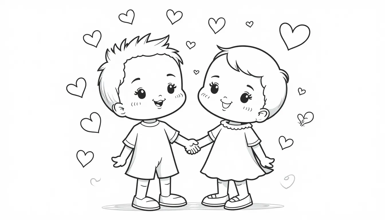 This playful coloring book image showcases two cute characters holding hands, surrounded by hearts. Designed with bold black outlines, it’s ideal for coloring enthusiasts of all ages. The white background enhances the focus on the characters, making it a great choice for printable coloring sheets.