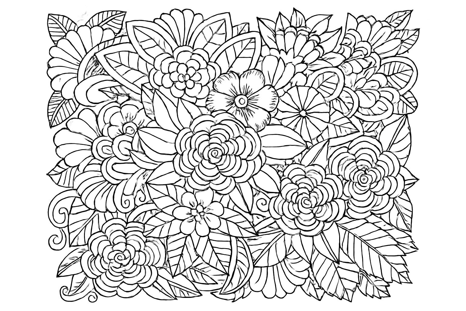 This coloring page showcases a lush arrangement of diverse flowers and leaves, presenting intricate details and bold outlines for coloring. The design includes large blooming roses, smaller petaled flowers, and richly veined leaves that create a dense and vibrant composition, perfect for relaxation and creativity.