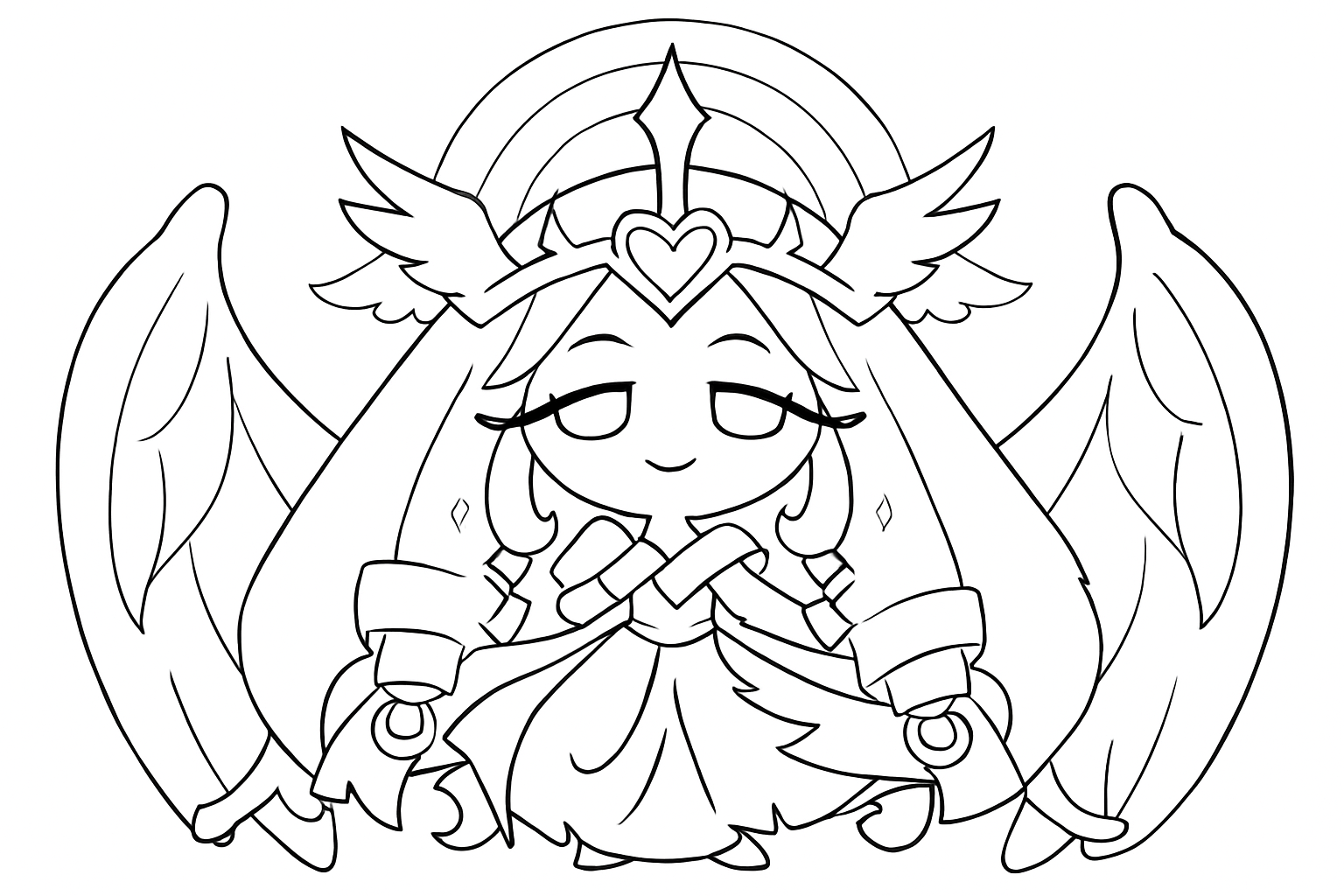 This stunning coloring page features a celestial anime-inspired guardian with a peaceful expression and intricate detailing. The character is adorned with a crown, flowing hair, and large wings, set against a simple background, making it an ideal choice for coloring enthusiasts. Perfect for inspiring creativity with its whimsical design and elegant features.