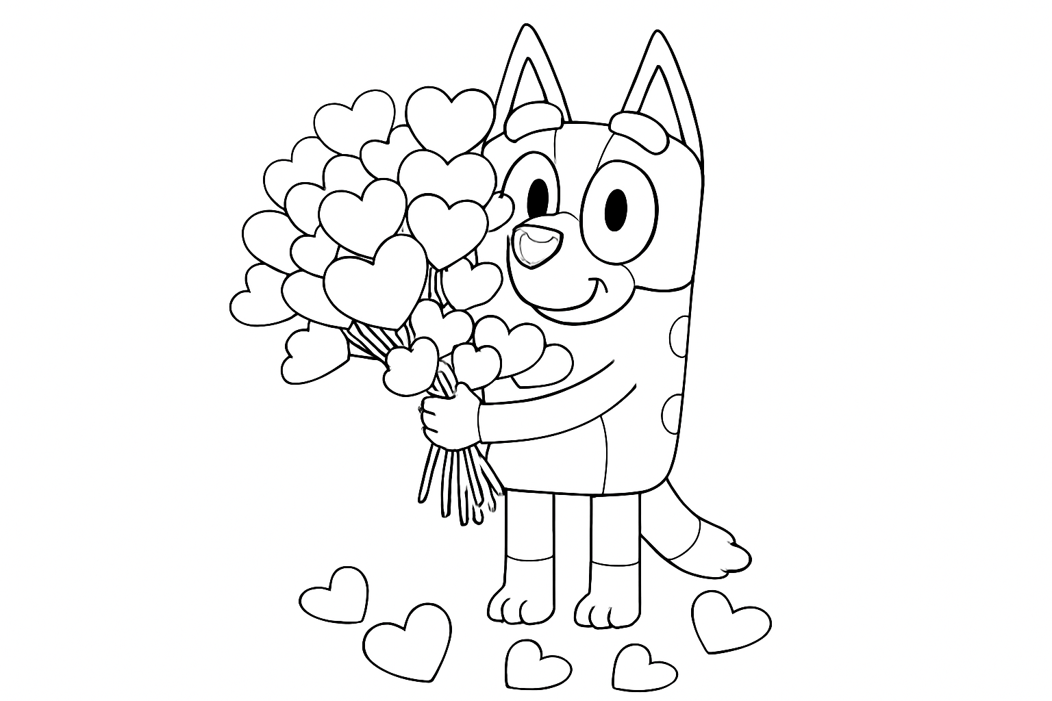 This delightful coloring page features a cheerful cartoon dog character holding a large bouquet made of heart-shaped flowers. With its friendly smile and playful stance, the dog is surrounded by scattered hearts in a whimsical and clean design, perfect for kids of all ages to enjoy coloring.