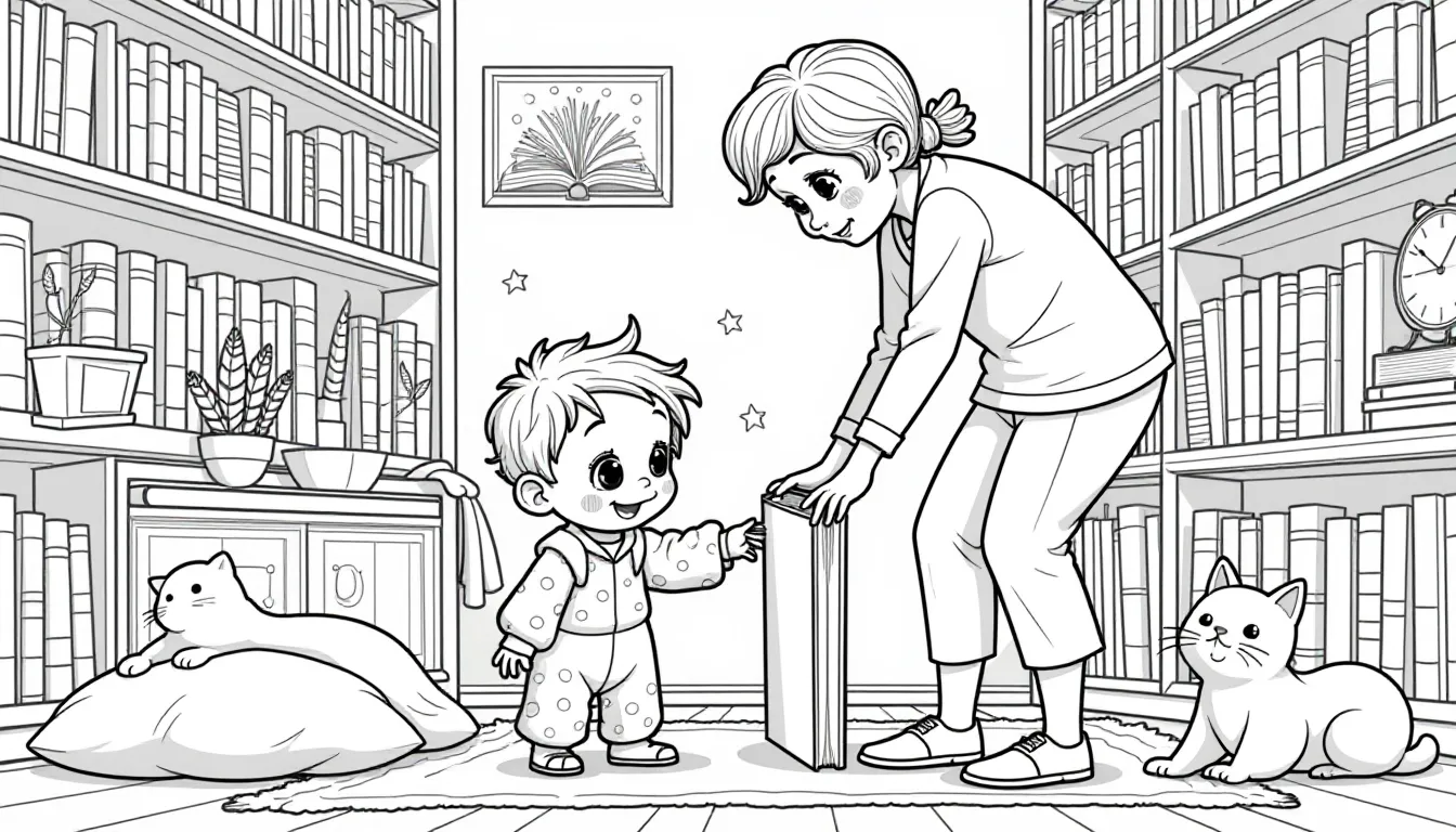 A whimsical coloring page depicting a cherubic child stretching toward a fascinating book on a towering bookshelf. An adult gently pushes the book aside, showcasing a nurturing moment. This cozy scene invites creativity and imagination. Perfect for young artists!