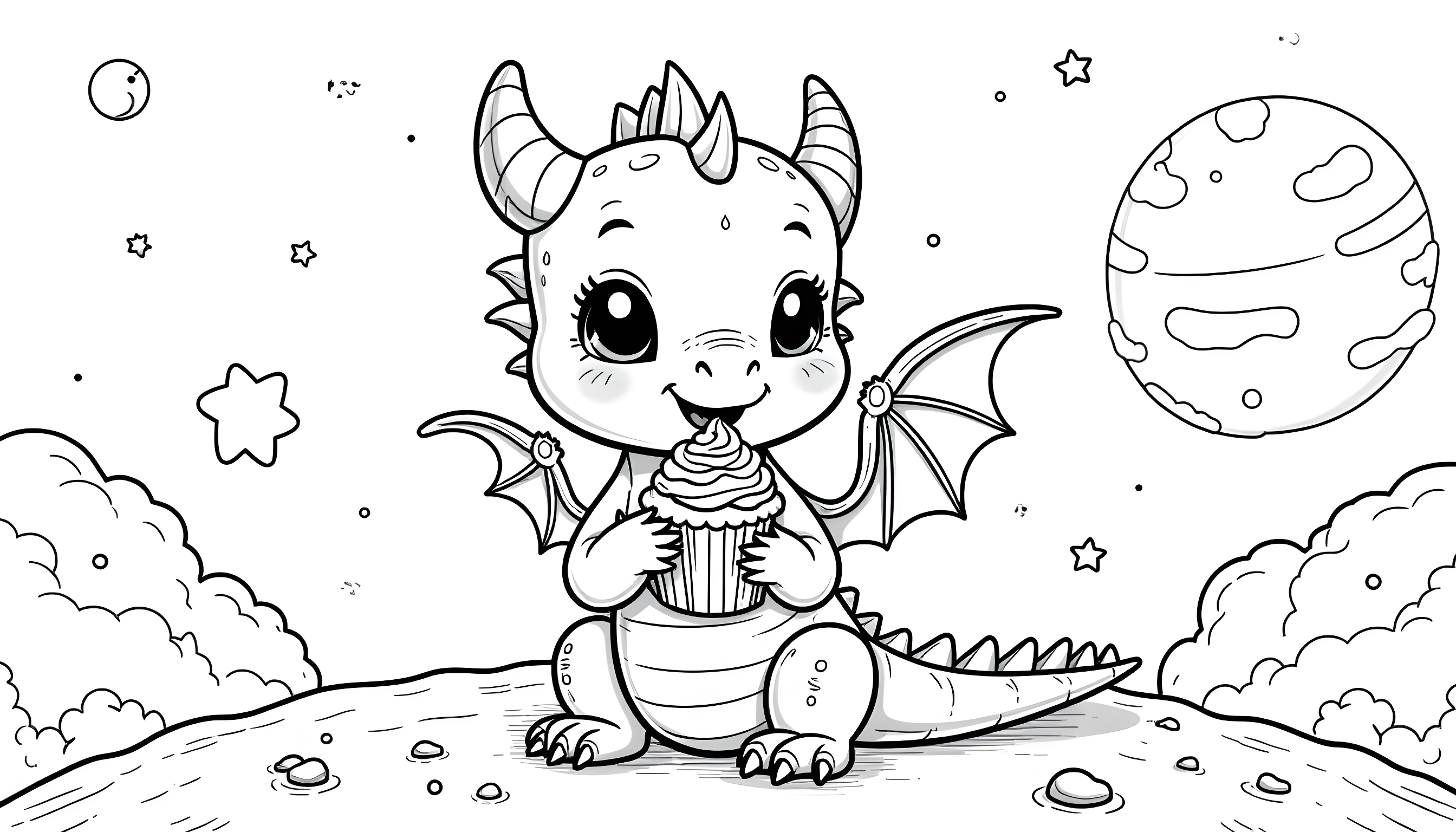 This charming coloring book image features a cute baby dragon happily munching on a cupcake while floating in space. With a landscape orientation, this delightful illustration is perfect for coloring enthusiasts of all ages.