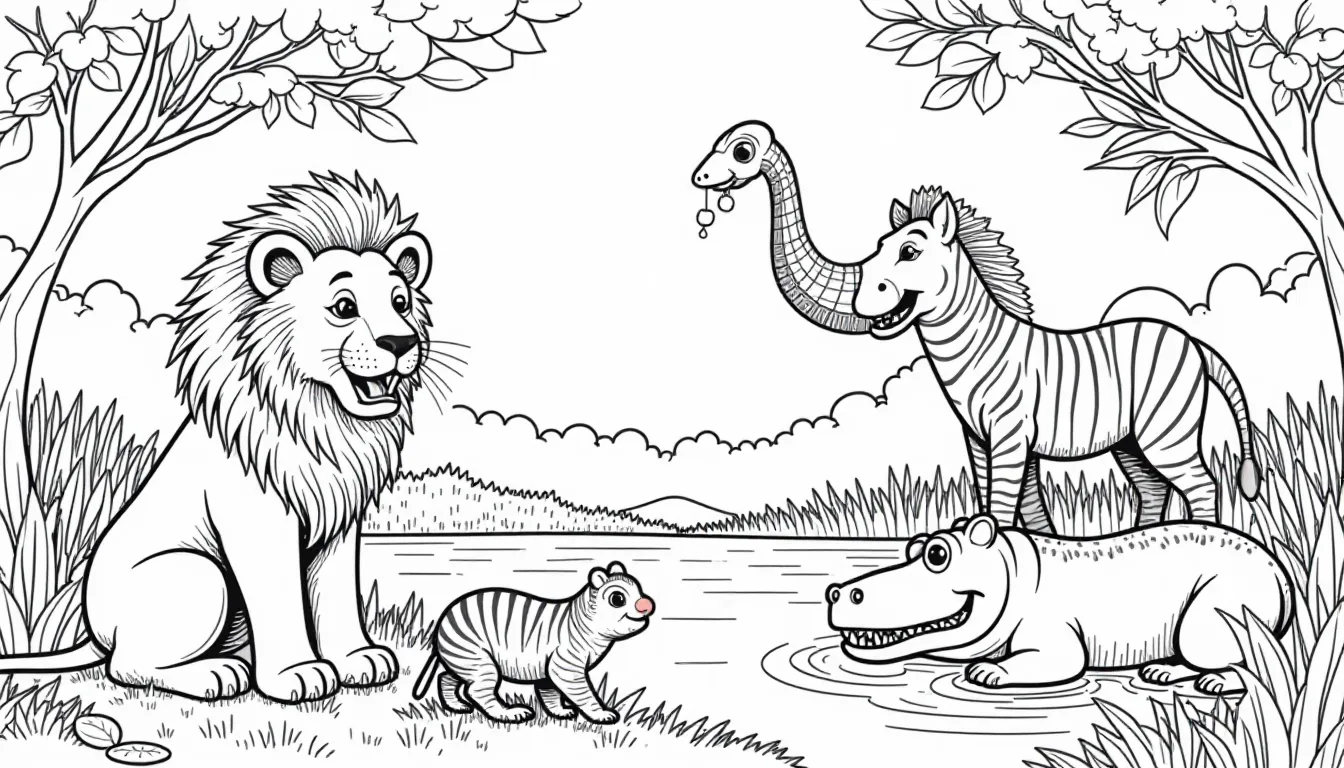 This high-quality coloring book image showcases a variety of jungle animals including a lion sitting, an elephant spraying water, a monkey swinging from a vine, and more. Ideal for children and kids' art activities, this black and white illustration invites creativity without colors or gradients.