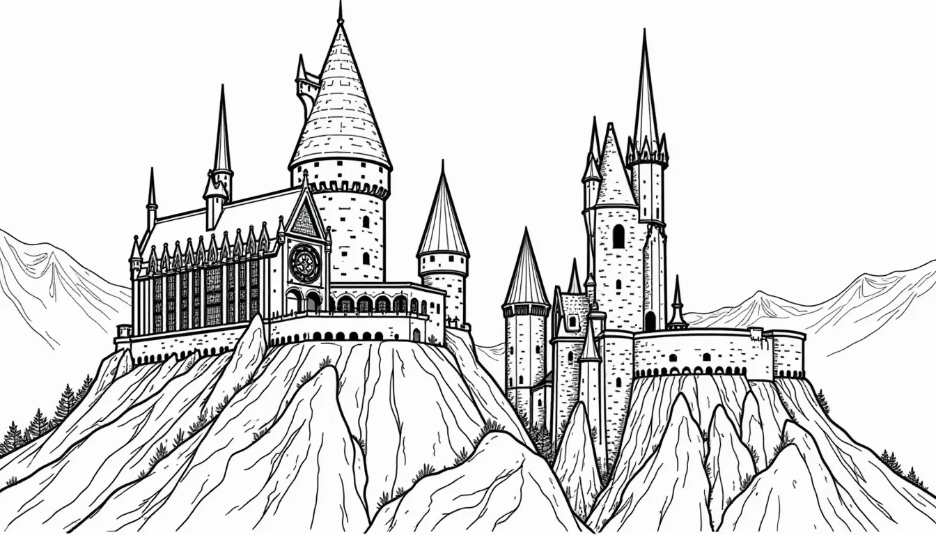 This landscape coloring book image features a detailed outline of the iconic Hogwarts Castle, designed for fans of the Harry Potter series to enjoy. Perfect for printable coloring sheets, this no-color, no-gradient image allows for creativity while coloring the magical architecture and surrounding scenery.