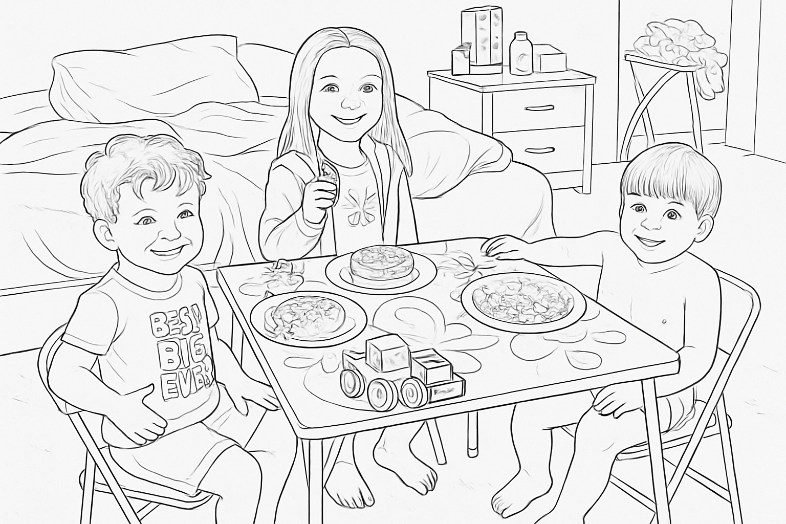 Create a coloring page based on this image, make sure to include all essential details of the image in the coloring page