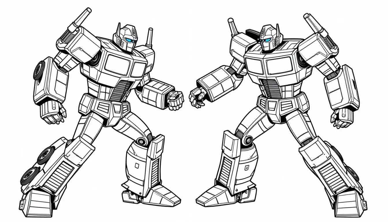 This landscape coloring page features an exciting scene of Optimus Prime from Transformers engaged in battle with another Decepticon. Designed for coloring enthusiasts, this image contains no color, gradients, or shading, allowing for a perfect canvas for creativity. Ideal for both children and adult fans alike.