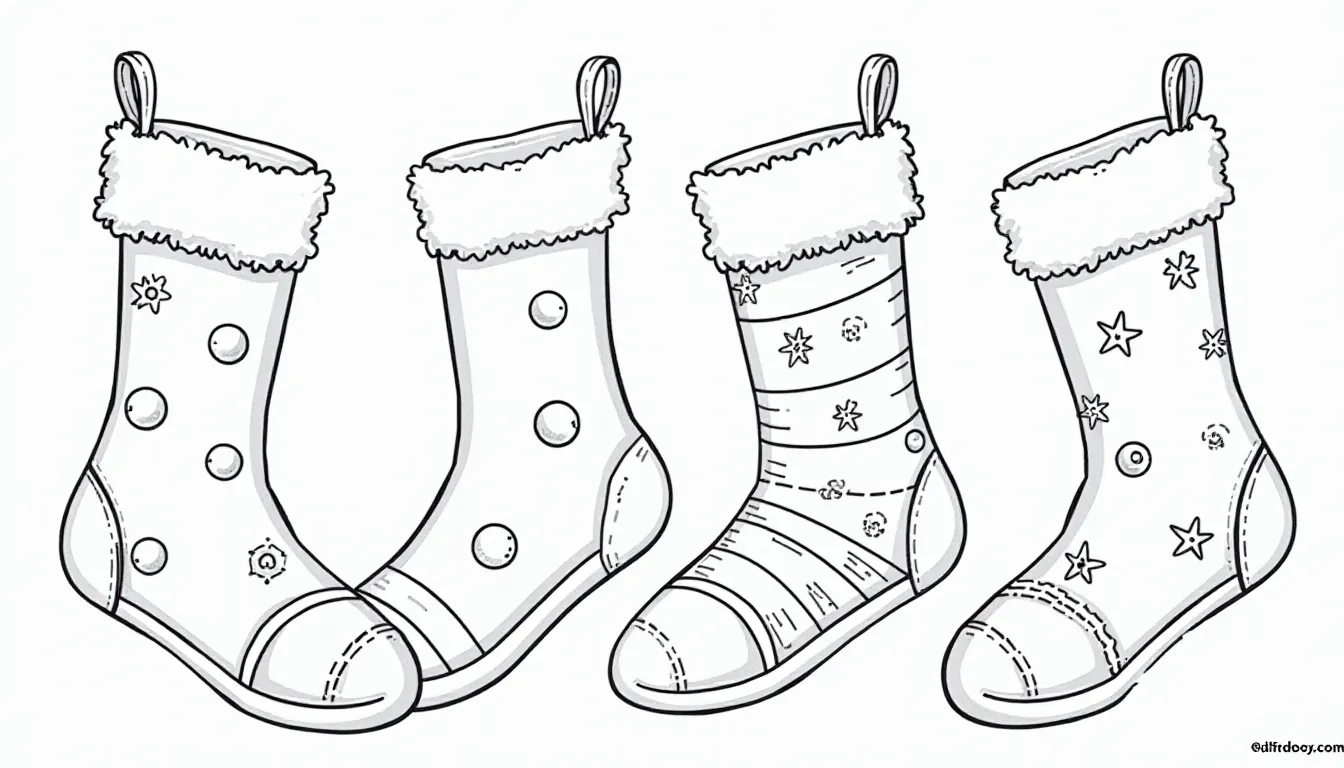 This image showcases a whimsical design of Christmas socks, perfect for coloring in a fun and festive style. The outlines are clear and bold, making it ideal for children and adults looking for a relaxing holiday activity. This printable page encourages creativity and joyful holiday spirit.