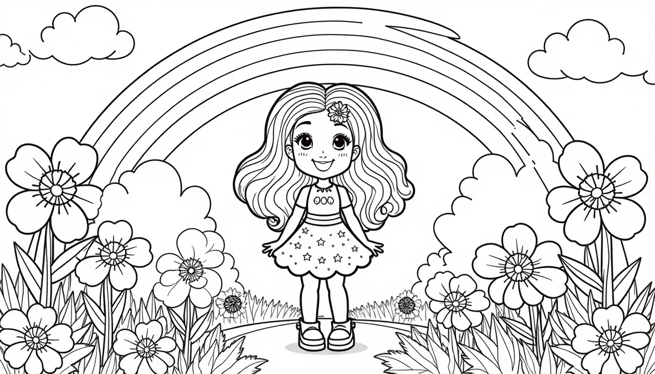 This charming coloring book illustration features Rainbow Brite, a beloved character with vibrant hair and a colorful outfit. Set in a lush garden with oversized flowers and her sprite friends, this design is perfect for coloring relaxation and creativity. The landscape surrounds a majestic rainbow, inviting coloring enthusiasts of all ages to bring the scene to life.
