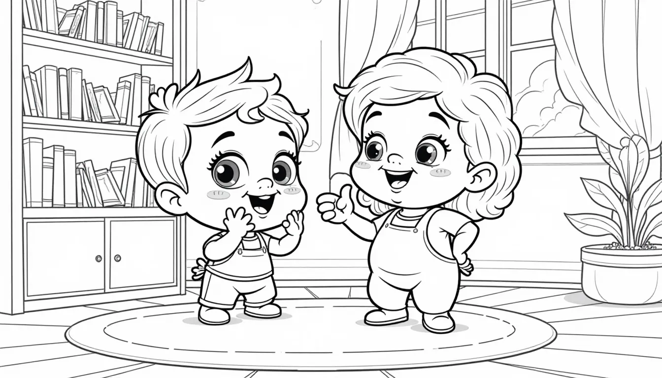 This whimsical black and white illustration features a playful child with big, expressive eyes trying to speak while an adult gestures for silence. The cozy room background is filled with elements like a bookshelf, soft rug, and sunny window, creating a warm atmosphere. Perfect for coloring, this page is designed with bold lines and no colors, ideal for creativity.