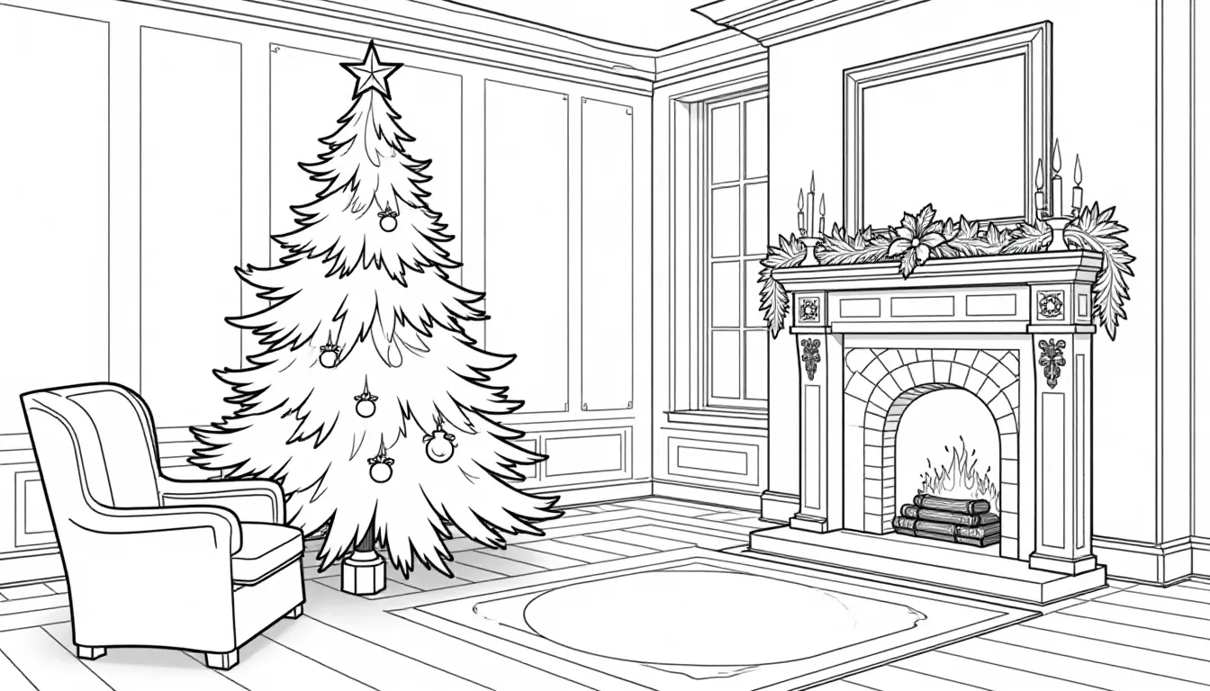 This intricate line art coloring page features a beautifully decorated Christmas tree inside a charming house with a traditional fireplace. Ideal for festive coloring fun for children and adults alike, this printable sheet allows creativity during the holiday season.