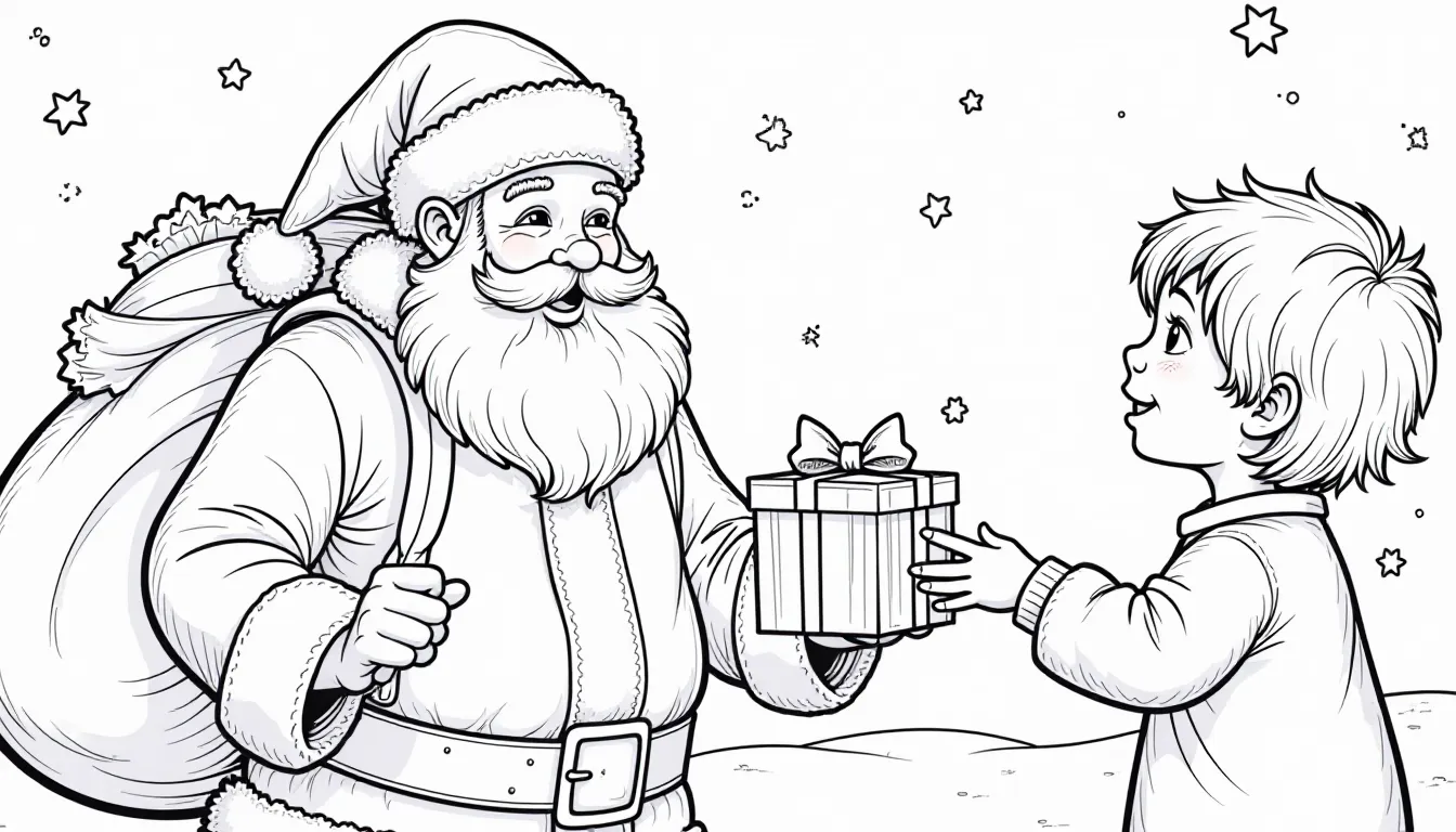 This delightful coloring book image features Santa Claus joyfully giving gifts to excited children. The outline design is specifically created for kids to enjoy coloring, making it an ideal printable for holiday-themed activities.