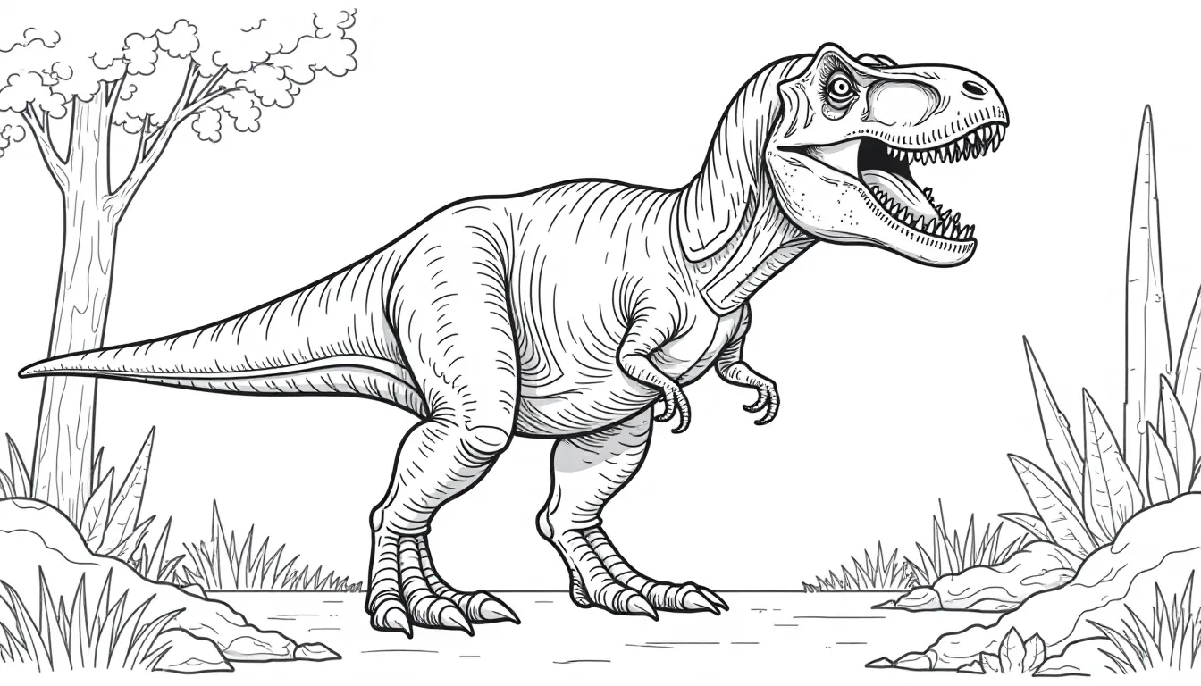 This coloring book image features a detailed outline of the iconic T-Rex from Jurassic Park, designed for coloring enthusiasts. Featuring clear lines and no gradients or shading, it is perfect for kids and adults who love dinosaurs!