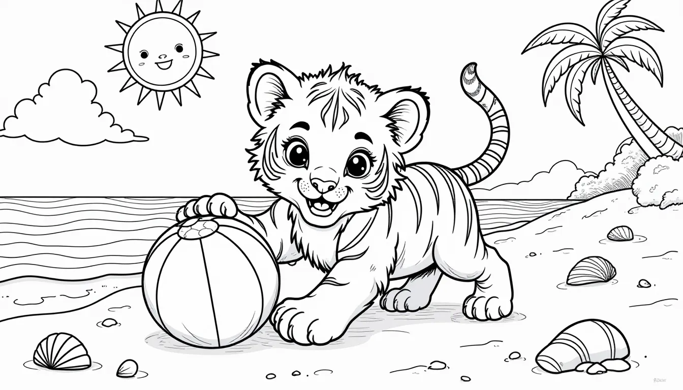 This charming coloring book page features a playful tiger cub mid-pounce with a beach ball. The fluffy cub has big, curious eyes brimming with joy as it embraces a vibrant beach setting complete with gentle waves, seashells, and palm trees, providing an exciting landscape for coloring.