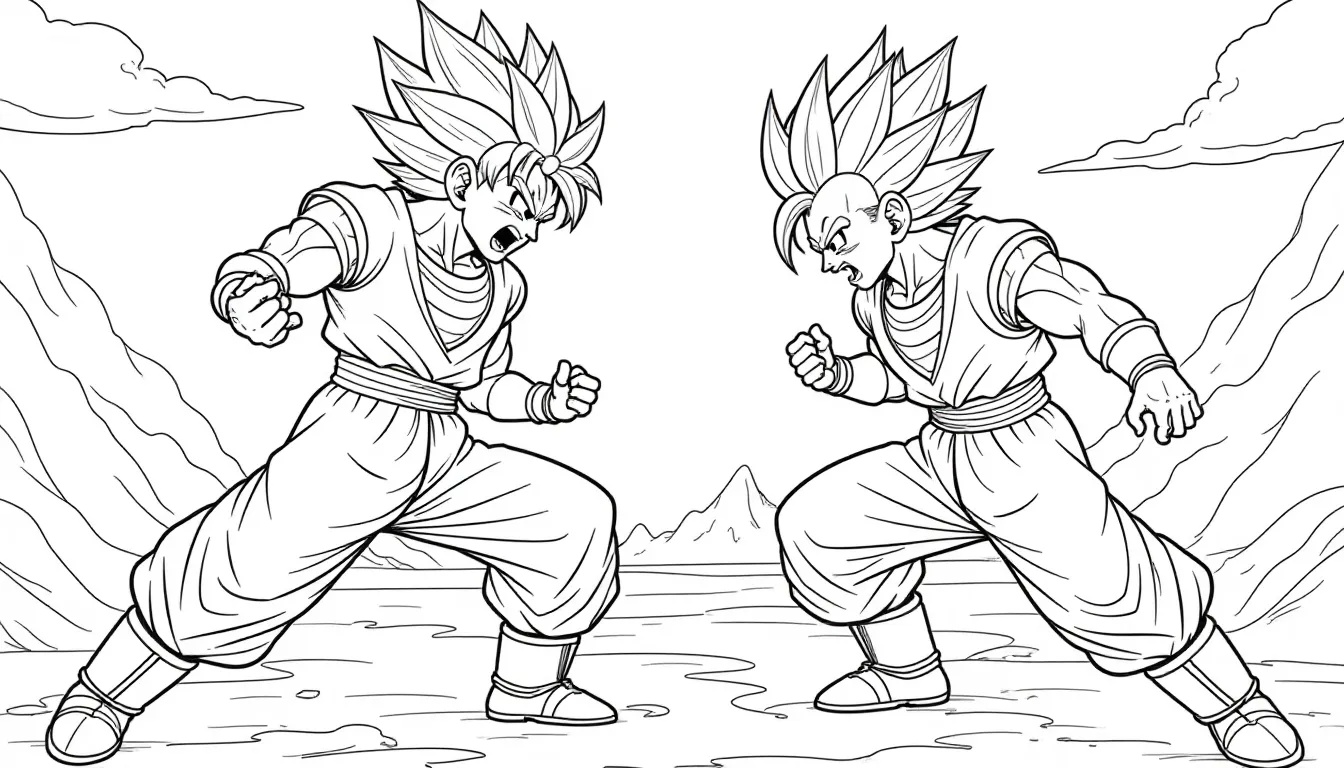 This image features a line art illustration of a Dragon Ball Z anime fight scene, designed for coloring. It showcases iconic characters in action, making it perfect for anime fans looking to unleash their creativity. This coloring page offers a detailed, no-color design, ideal for all ages.