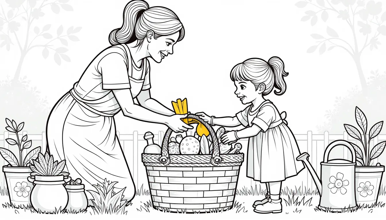 This line art coloring page features a heartwarming scene of a mother and daughter joyfully packing gardening tools into a basket. With thick outlines, the design includes a whimsical trowel, gardening gloves, and charming elements that will engage both children and adults in a creative coloring experience. Perfect for family fun and gardening lovers!