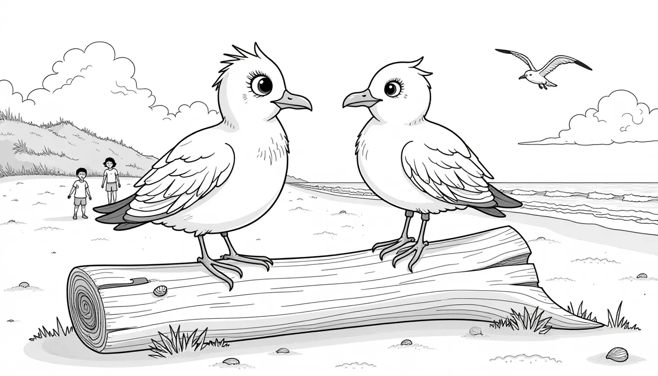 This delightful coloring book image depicts RT Byrd, a charming bird character, meeting Gordon Guller, a wise seagull, on a beautifully textured driftwood log. Set against a serene beach backdrop, children play joyfully in the sand while distant seagulls soar above. Ideal for coloring enthusiasts, this intricate black and white illustration invites creativity and relaxation.