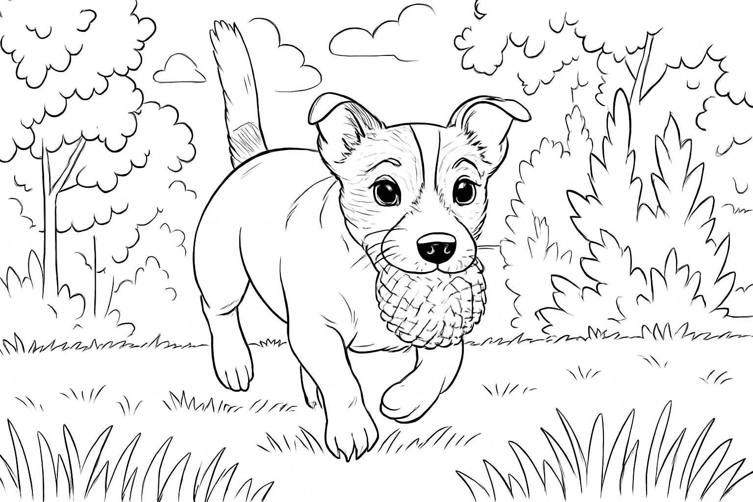 This delightful coloring page showcases a playful dog mid-run in a lively outdoor setting, featuring textured fur and an expressive face. The scene is enriched with stylized trees, bushes, and a grassy ground, all inviting coloring creativity. Perfect for both kids and adults, this image guarantees a joyful coloring experience.