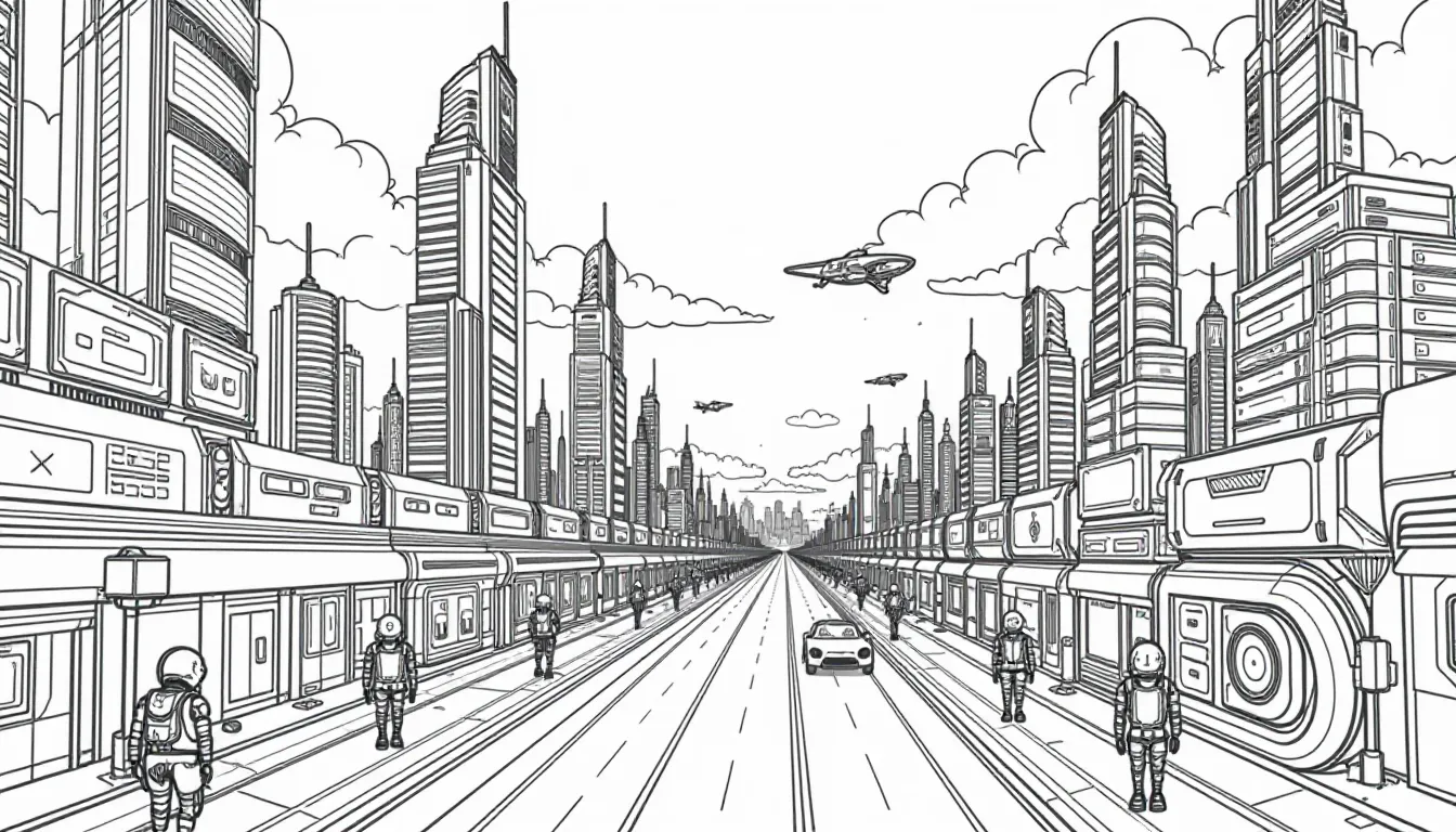 Futuristic City Coloring Page - Year 2145 Illustration✏️🎨