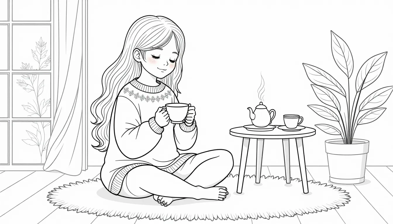 This charming coloring page features a cozy scene of a young girl peacefully enjoying her tea. The illustration is designed in a minimalist style, showcasing her serene expression and a few simple yet elegant elements like a table with teacups and a potted plant. Ideal for those looking to relax and unleash their creativity with a soothing coloring experience.