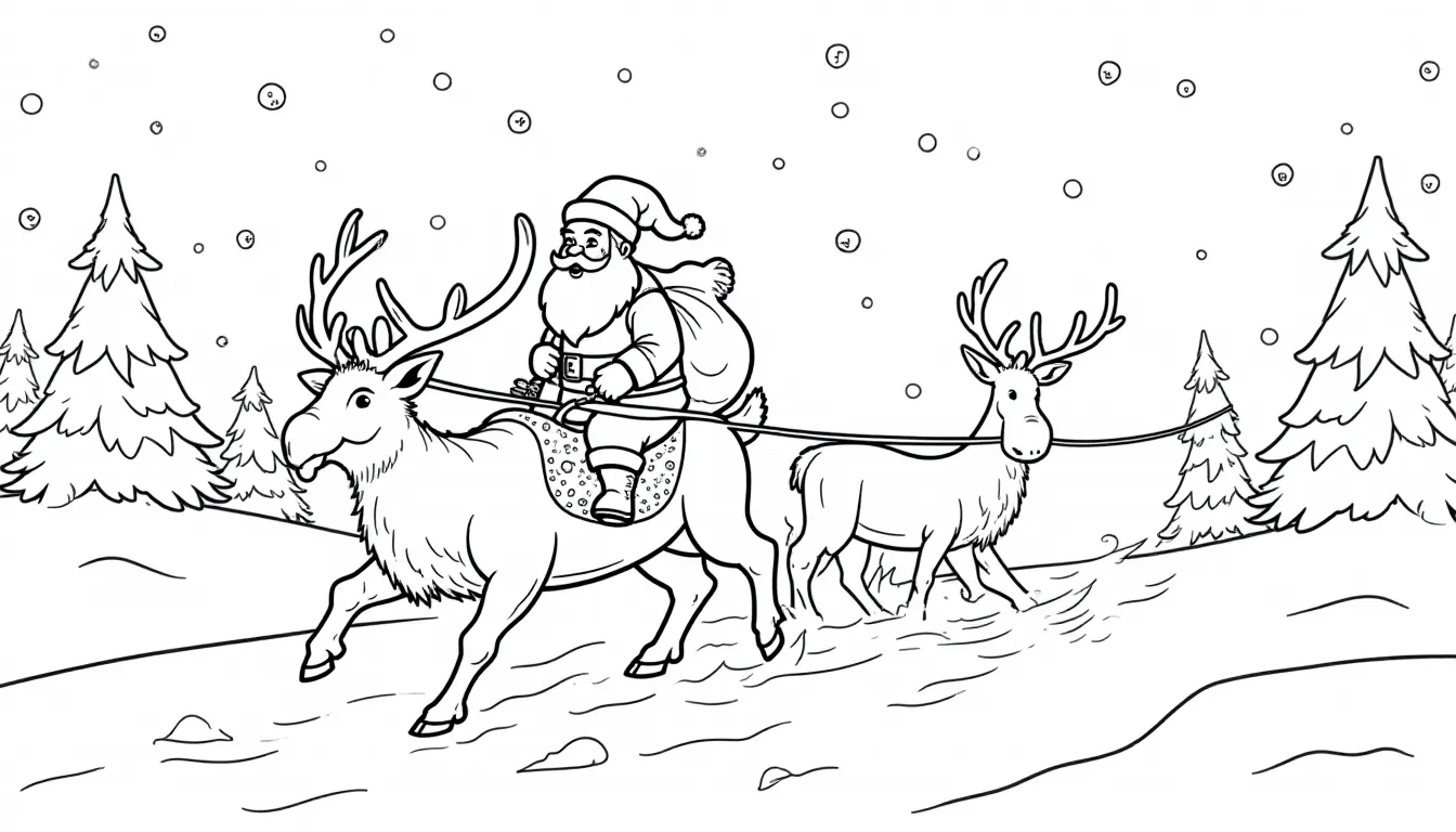This coloring book image features Santa Claus joyfully riding on his slay, pulled by cheerful reindeers. The design is outlined clearly, making it ideal for kids to color, enhancing their creativity during the festive season. Perfect for holiday-themed coloring activities.