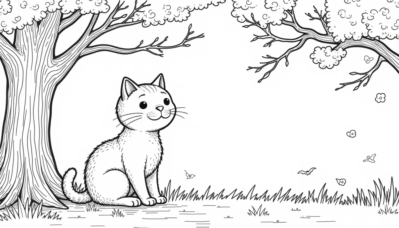 This coloring book style image features a cute cat enjoying the view from a Halloween tree. Perfect for coloring enthusiasts of all ages, this landscape picture provides a fun and festive activity for Halloween. Download this line art to create your own colorful masterpiece!