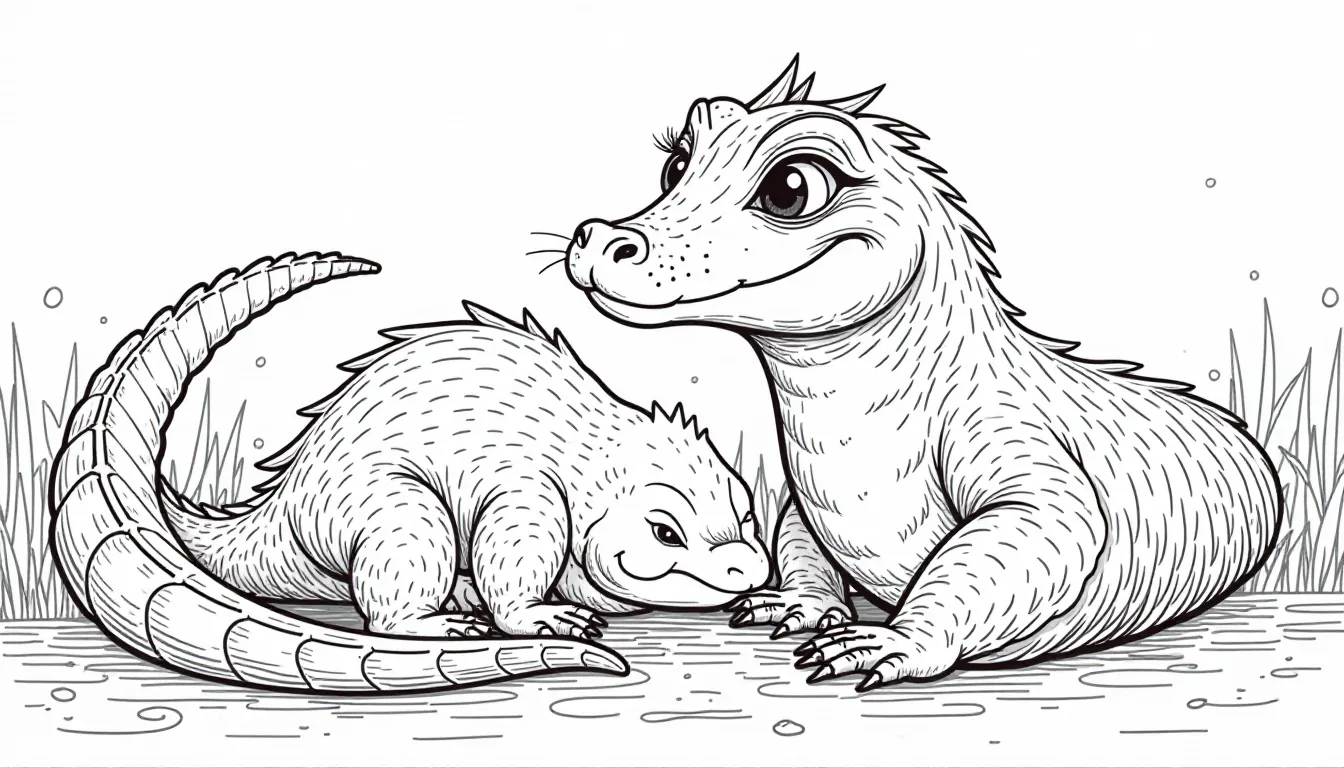 This coloring page features a charming scene of a young lion making friends with a playful lizard. The design is simple, without color, gradients, or shading, allowing young artists to unleash their creativity. Perfect for children's coloring activities!