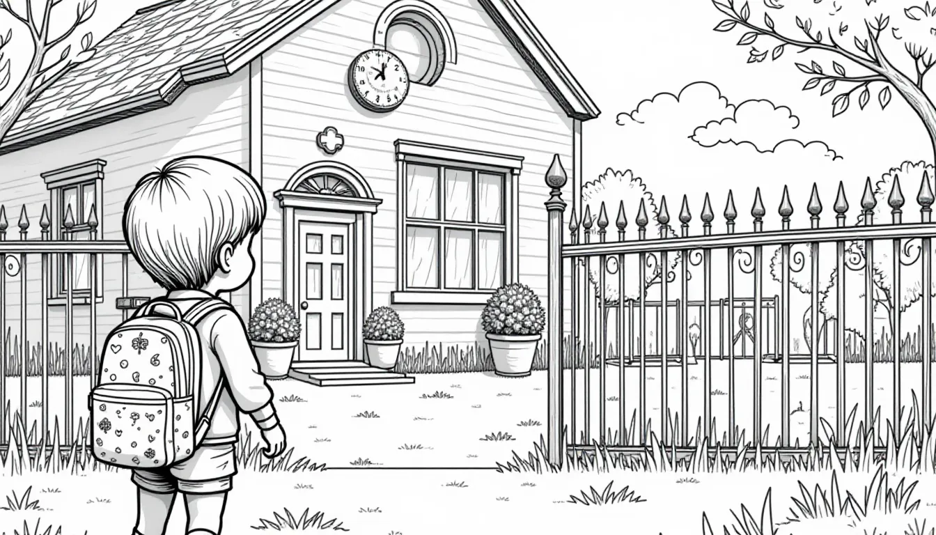 This captivating coloring book image features a charming school with open doors and a young child outside the wrought-iron fence looking longingly. The detailed, black-and-white illustration invites colorists to fill in the intricate designs of the school, the child’s oversized backpack, and the leafy surroundings. Perfect for creativity and imaginative play!