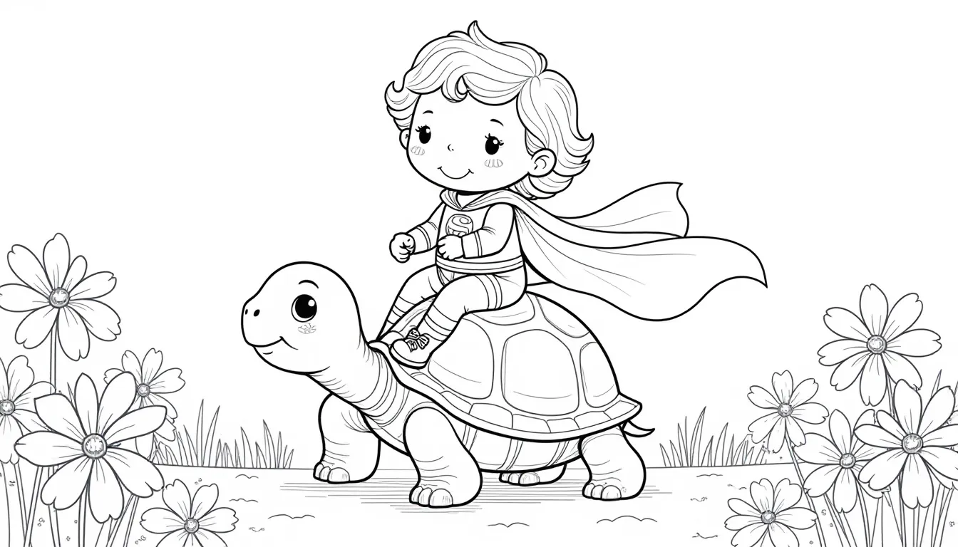 This enchanting coloring book page features a playful superhero with an oversized head riding a friendly turtle, complemented by whimsical, oversized daisies. Hand-drawn with soft lines, this black and white illustration is perfect for coloring enthusiasts seeking a charming and cozy cartoon aesthetic. Enjoy adding your colors to this delightful adventure!